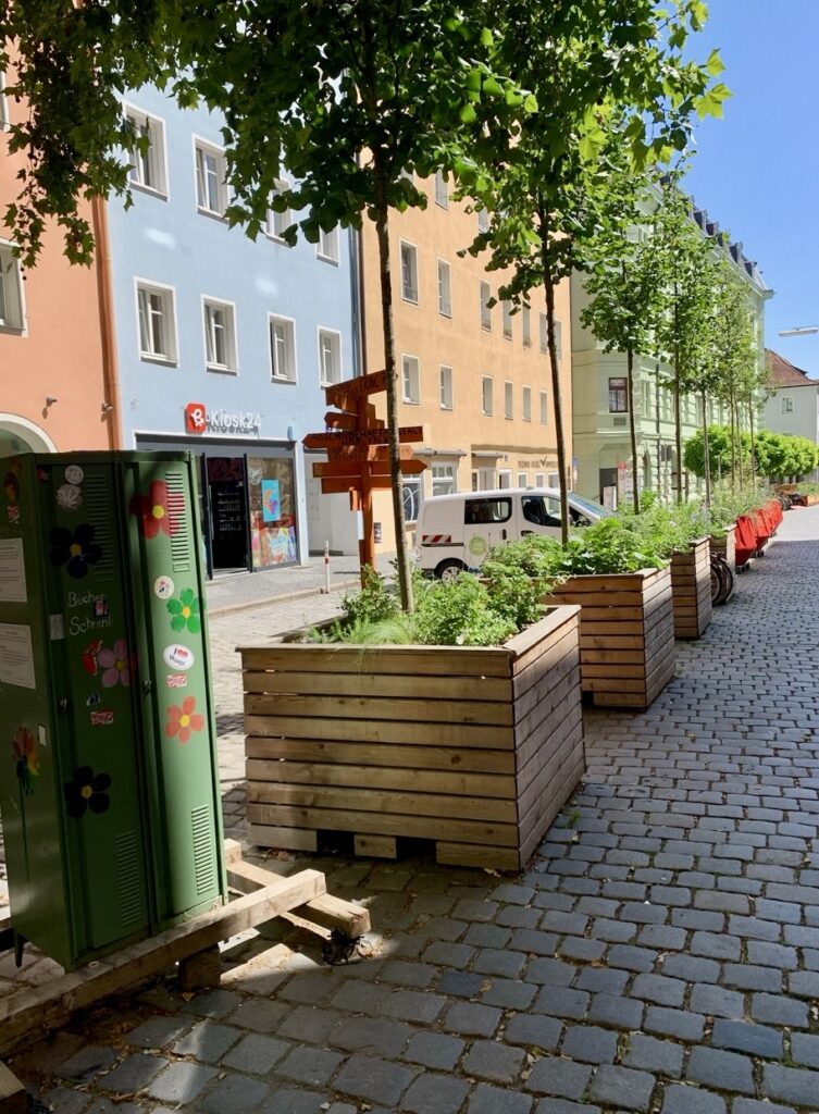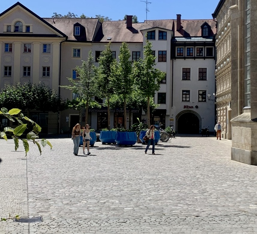 Heute soll es 33° werden. Gestern in Regensburg hat man ja schon gemerkt, was das in einer zugepflasterten, steinernen Stadt bedeutet. Aber auch dort hat man angefangen Kübel mit Bäumen und Pflanzen auf den Plätzen aufzustellen. Immerhin.