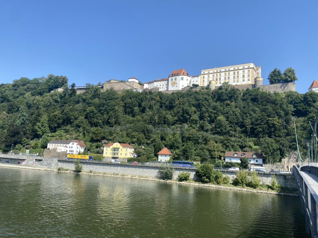Wir fahren zur Veste Oberhaus. Eine Festung oberhalb der Donau auf der nördlichen Seite. Abenteuerliche 22% geht die Straße hier hoch. Das müssen wir dann alles wieder runterlaufen (und anschließend ja auch wieder hoch). Aber wir werden belohnt mit einem wunderschönen Blick auf Passau.