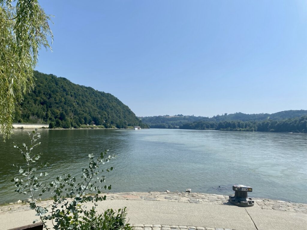 Unten laufen wir erstmal zur Halbinselspitze. Sehr gut ist die Kante zu sehen, wo das milchigtrübe Wasser des Inn und die „blaue“ Donau aufeinandertreffen.