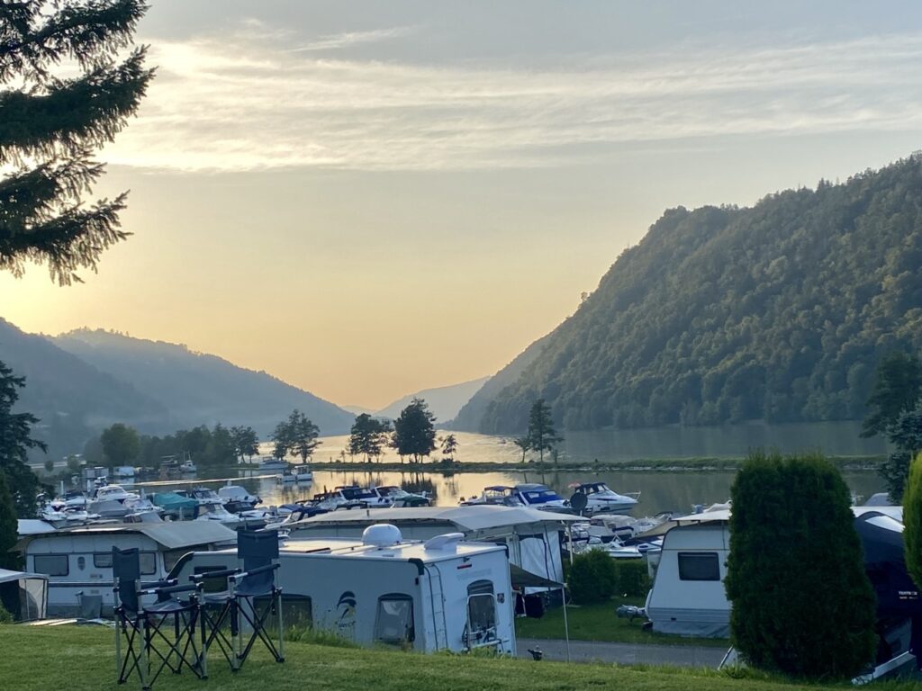 An der Schlögener Schlinge landen wir dann auf einem Campinplatz. Die beiden beinahe 180°scharfen Flusskurven wollen wir morgen mit dem Fahrrad erkunden.