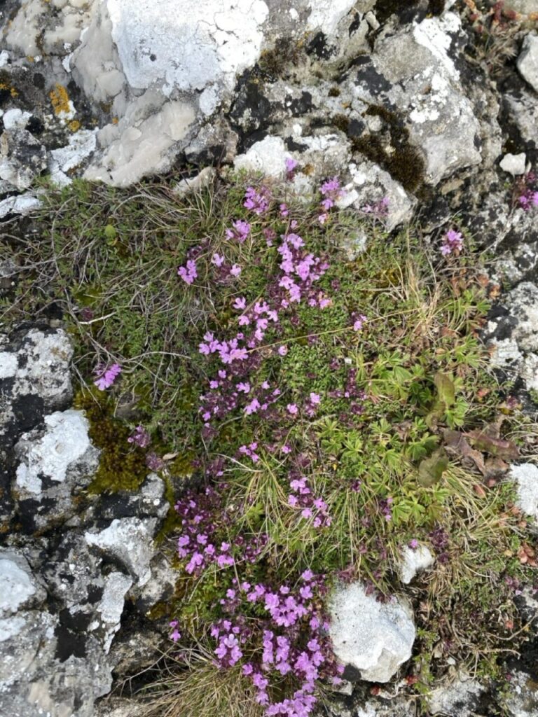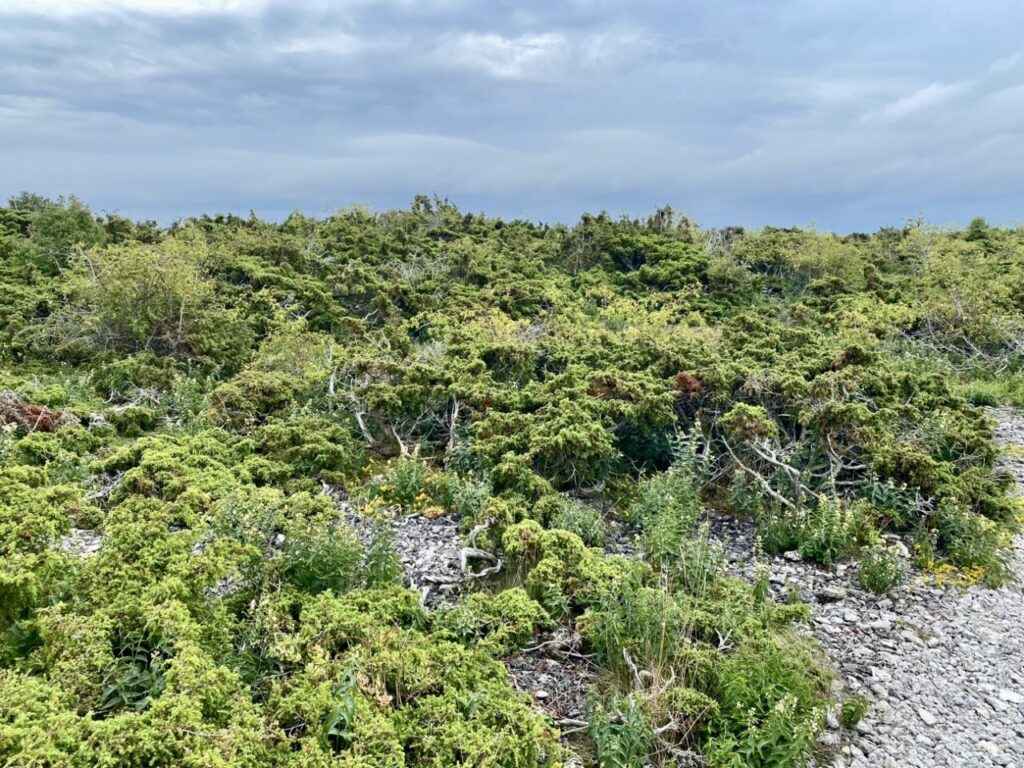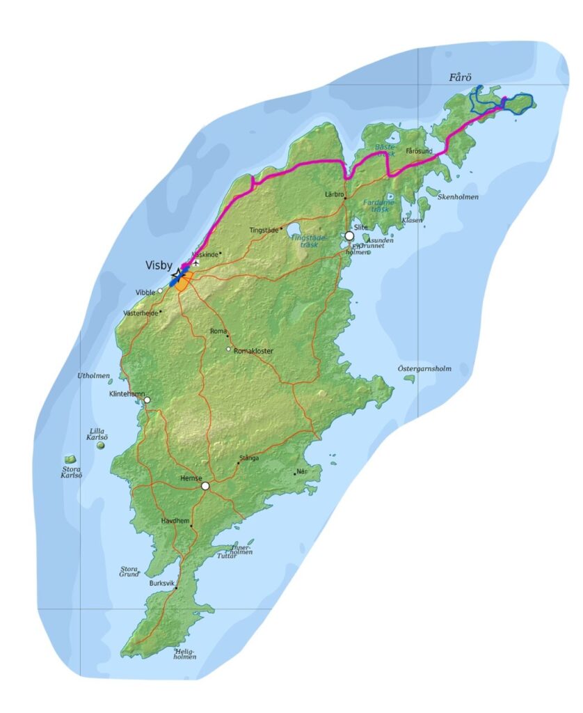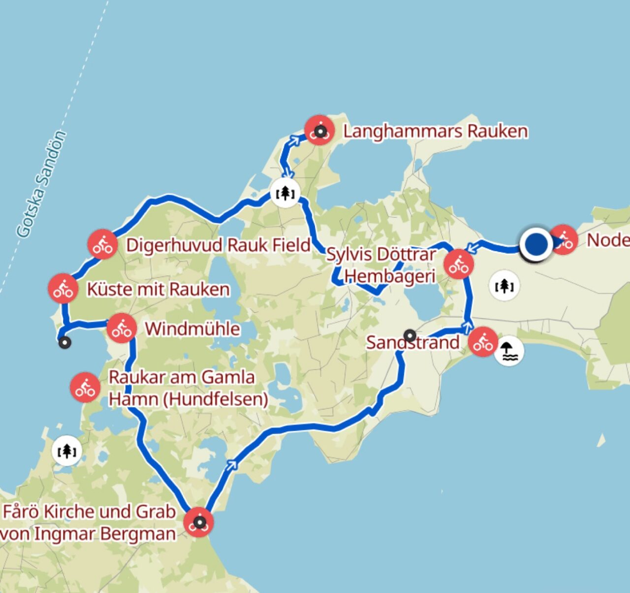Wir fahren auf Kalksteinschotterwegen durch die typische Landschaft mit Wachholder und niedrigen Kiefern. Auf der dünnen Erdschicht wächst manchmal nur noch Sandthymian. Zeitweise fahren wir auf der Fahrradroute des Gotlandsleden, der einmal um Gotland herumführt. Mehrere Viehgatter müssen geöffnet und wieder geschlossen werden. Der Weg ist teilweise ziemlich holprig.