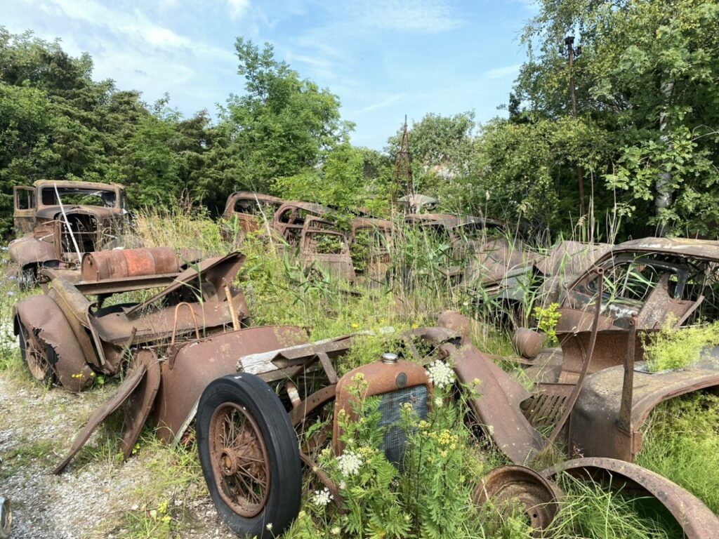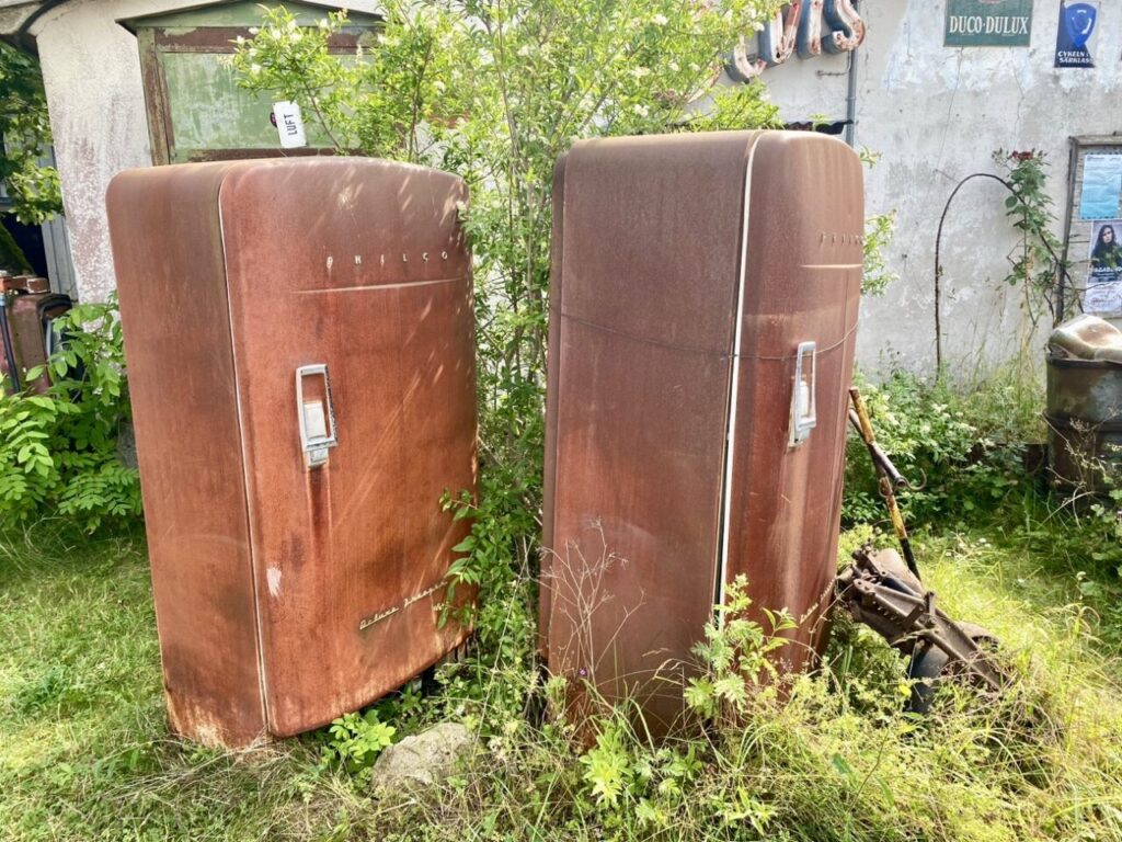 An der Westseite der Insel kommen wir an einem Anwesen eines typischen schwedischen Sammlers vorbei. Mehrere verrostete alte Autos, Autoteile, aber auch alte Kühlschränke und anderes zieren sein Grundstück. So etwas sieht man öfters in Schweden.