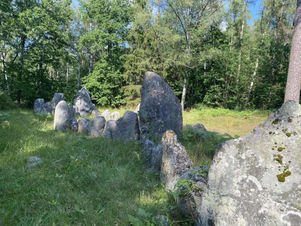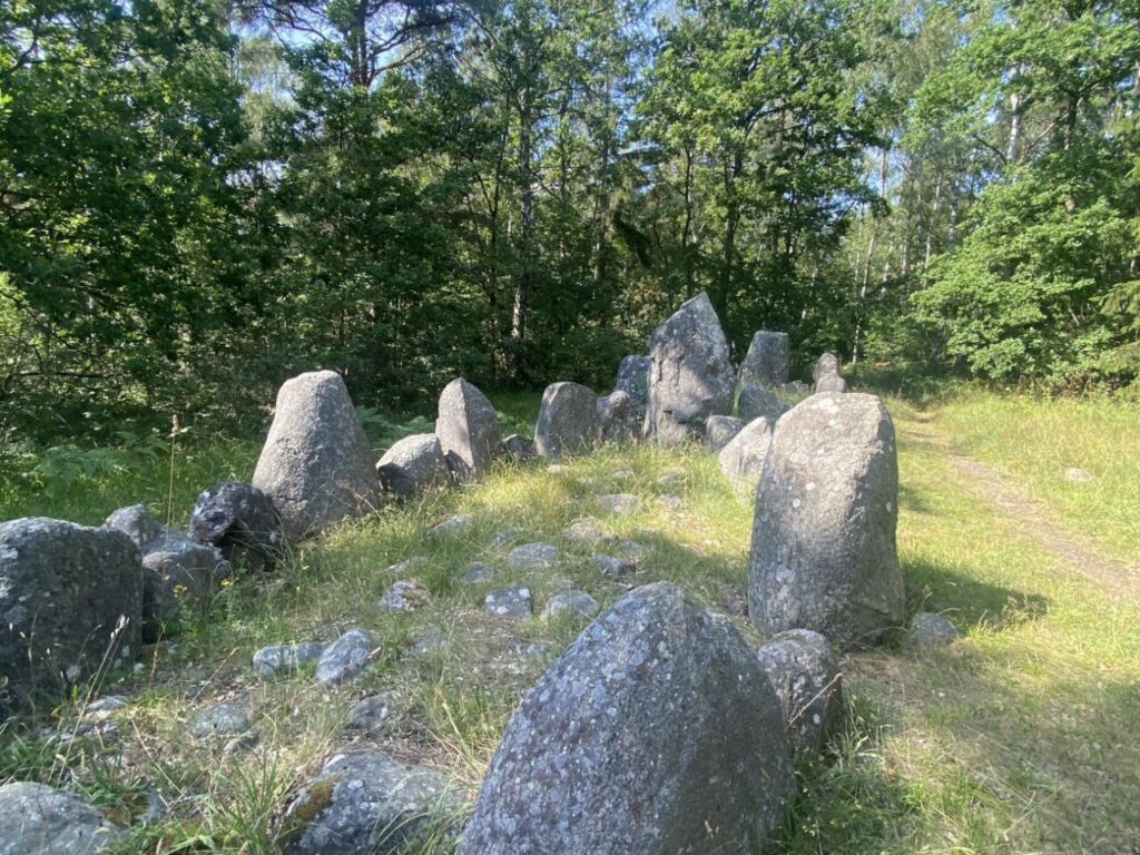 Diese Steinsetzungen sind Gräber aus dem späten Bronzezeitalter. Bei diesem sind vier mit Steinen gesetzte Schiffsformen zu sehen. Jeweils ein hoher Stein markiert den Steven und das Heck.