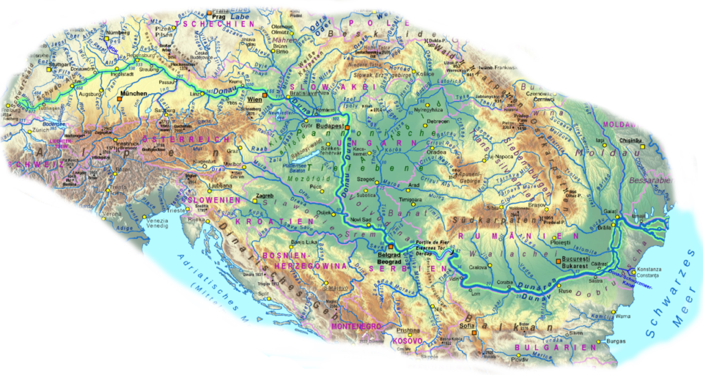 Die Donau ist 2850 km lang und fließt durch 10 Länder. Davon gehören 7 zur EU und in 4 kann man mit dem Euro bezahlen. Wenn wir es bis zur Mündung in das schwarze Meer schaffen, werden wir mindestens 6 Länder besucht haben.